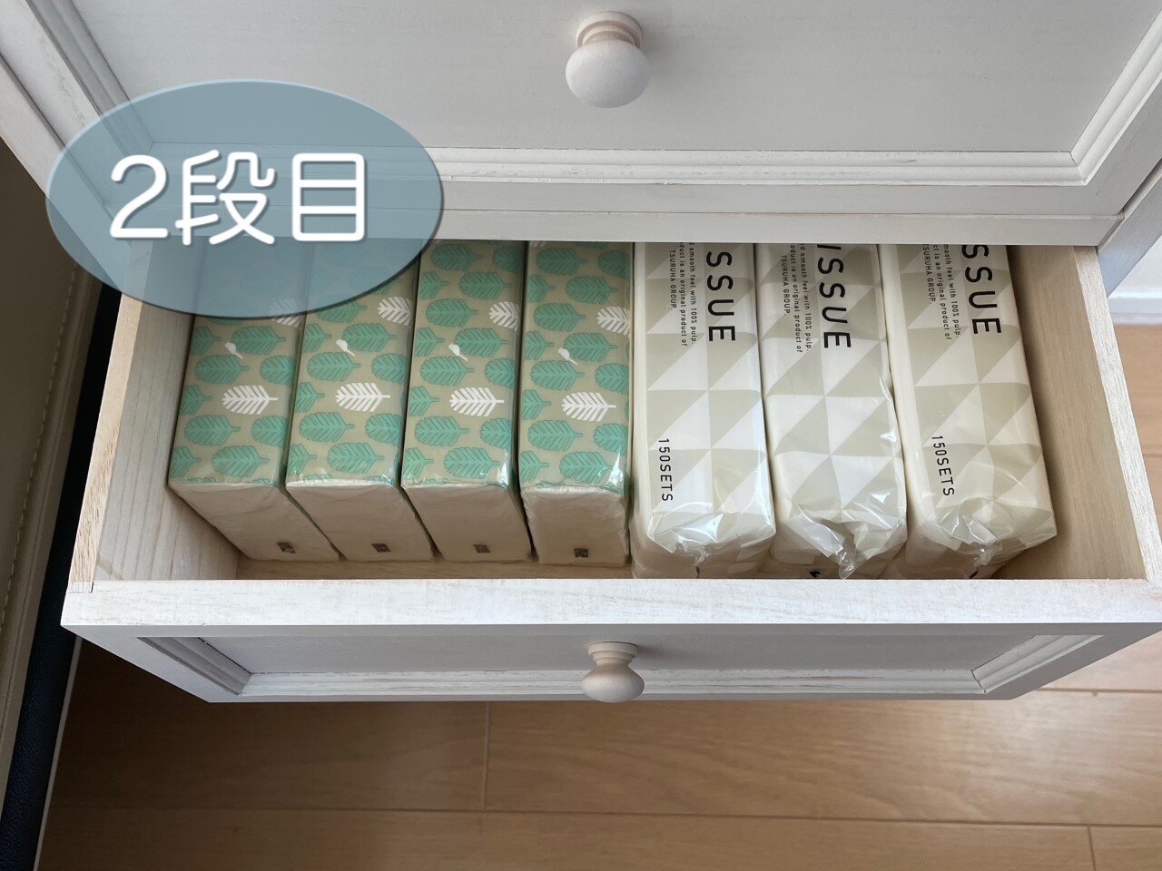 中段にしたのはティッシュの減りが早いので手を伸ばしやすい2段目に。