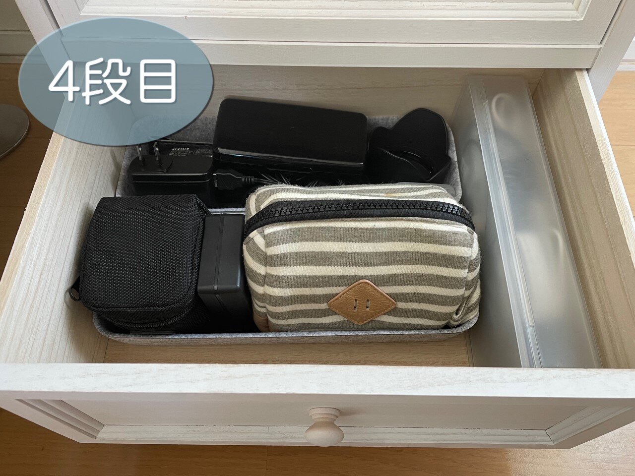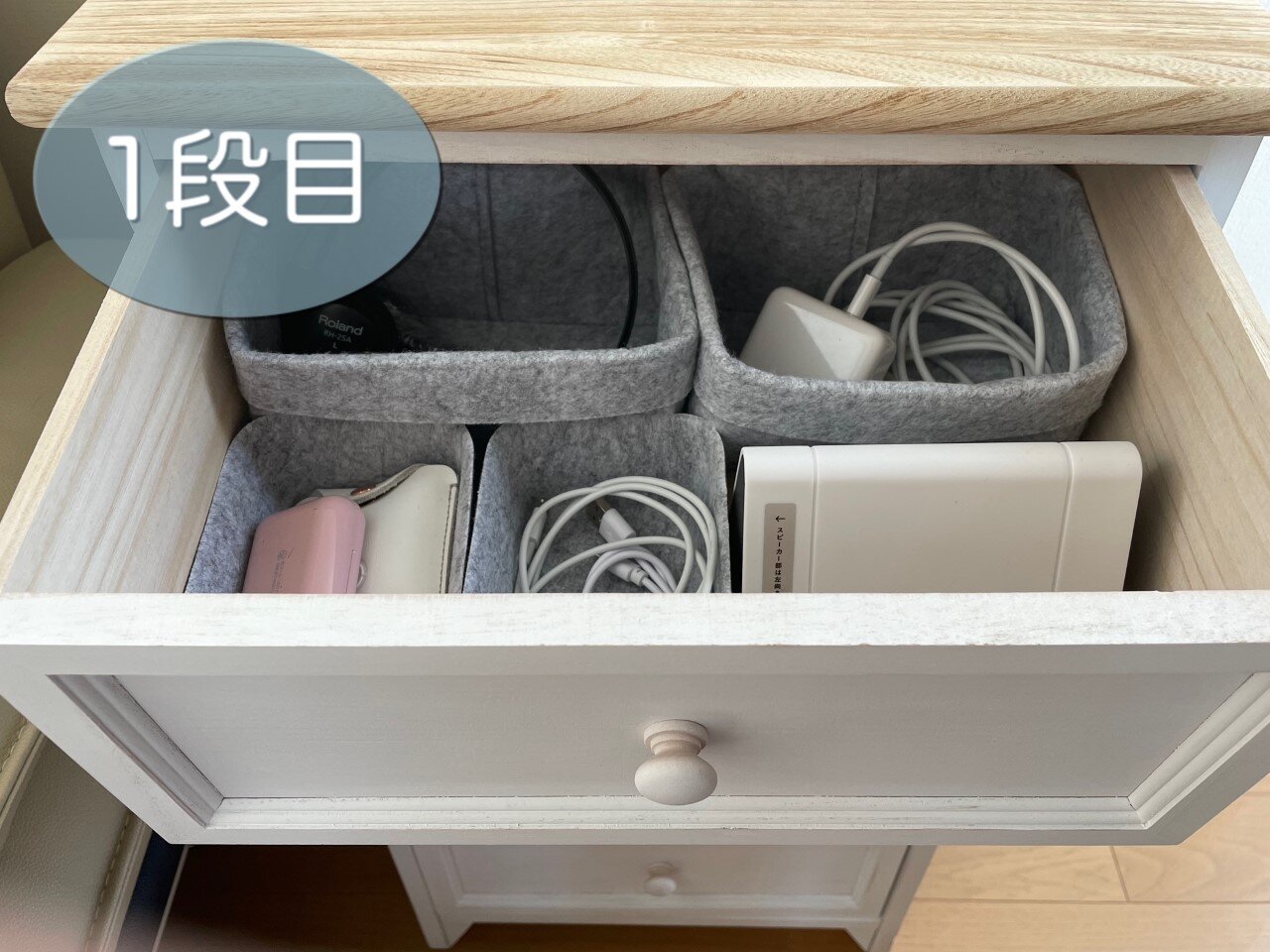 ここはパソコンのアダプターやヘッドフォンなど収納しています。
